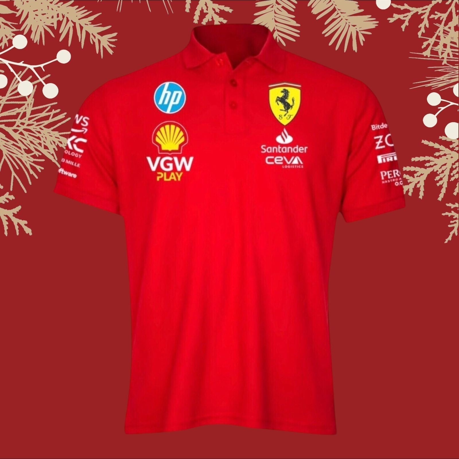 - Diseño Elegante: Con el emblemático logo de Ferrari en el pecho y detalles en rojo, esta polera presenta un diseño sofisticado que refleja la excelencia de la escudería.